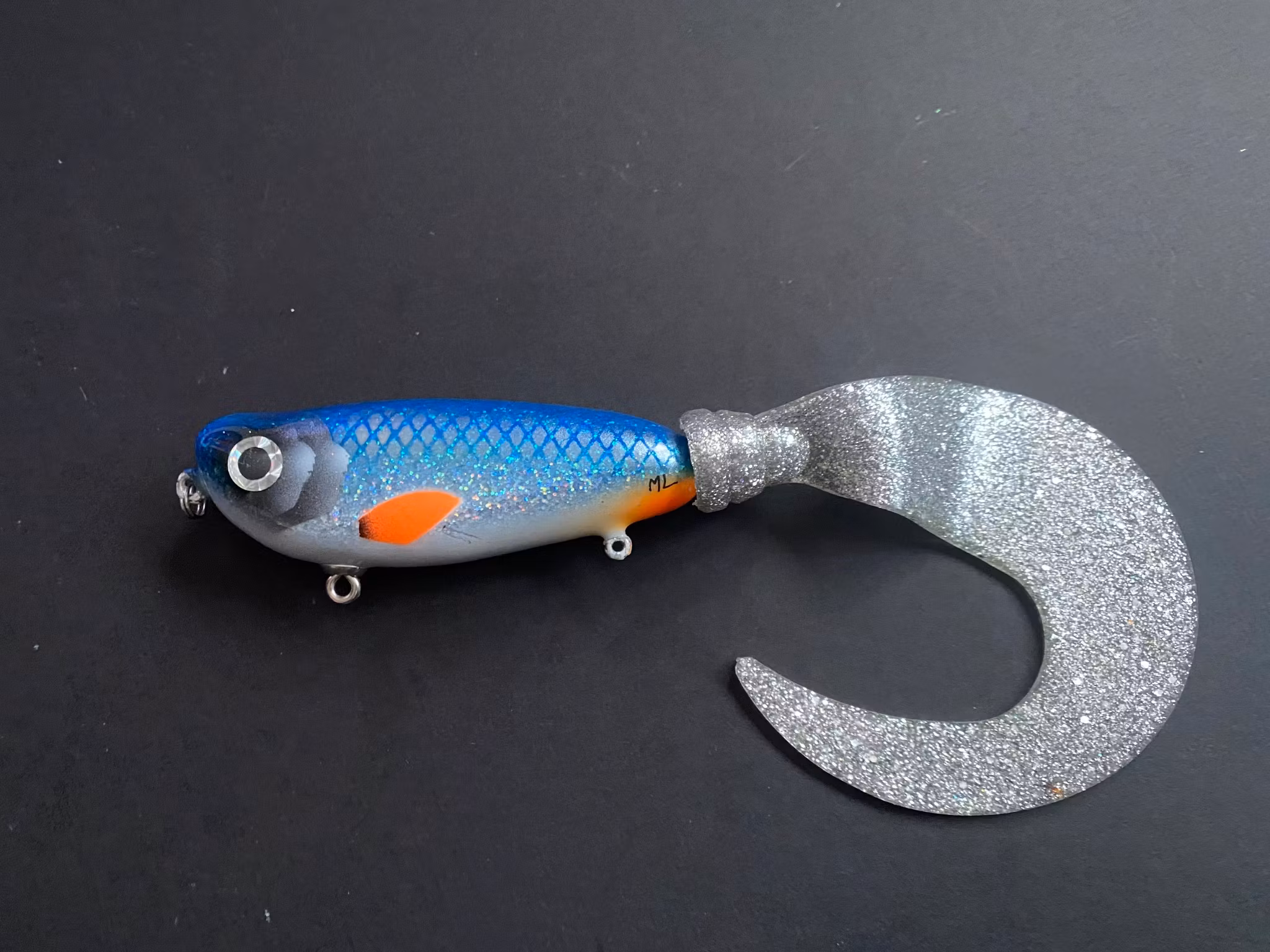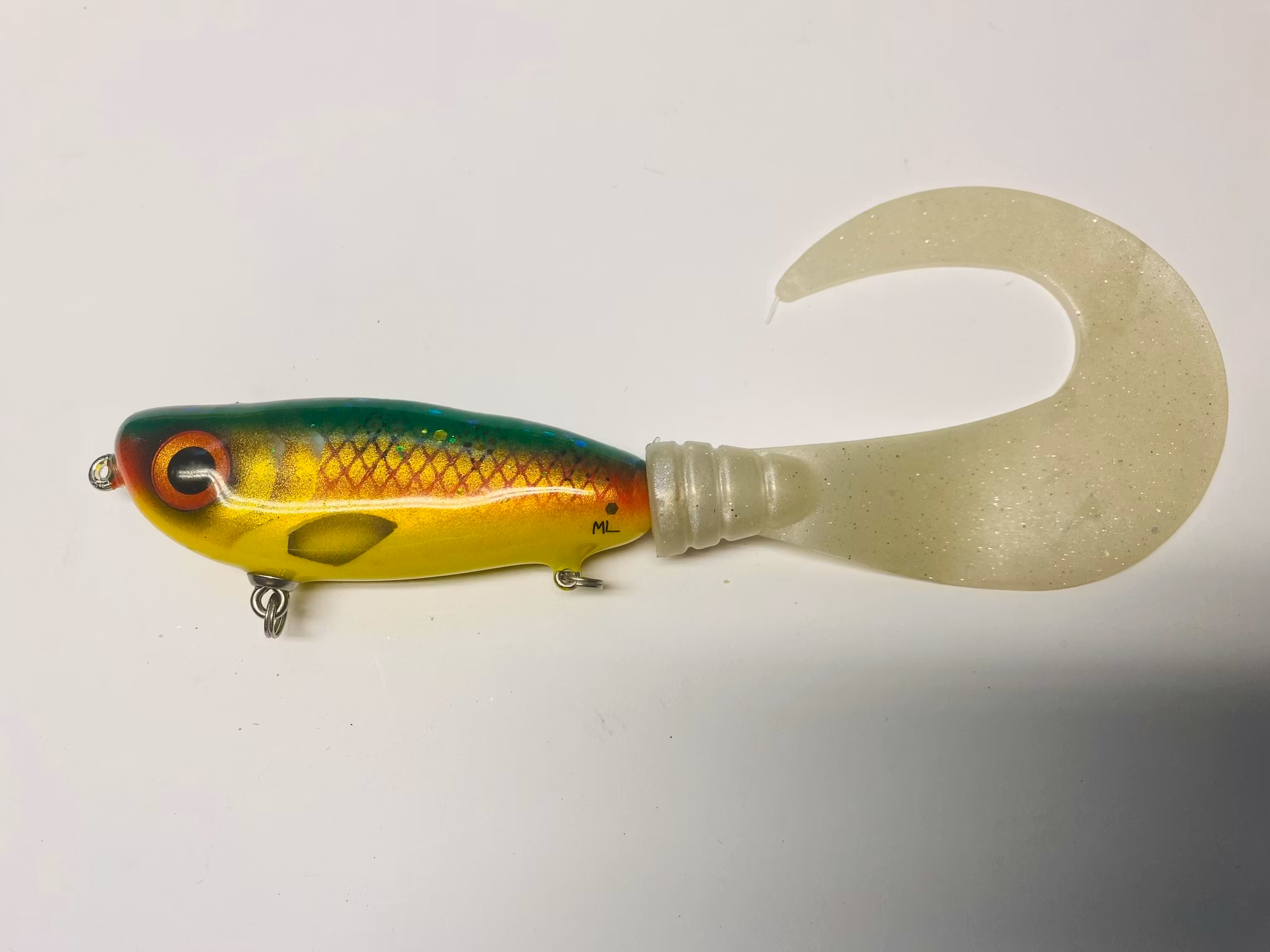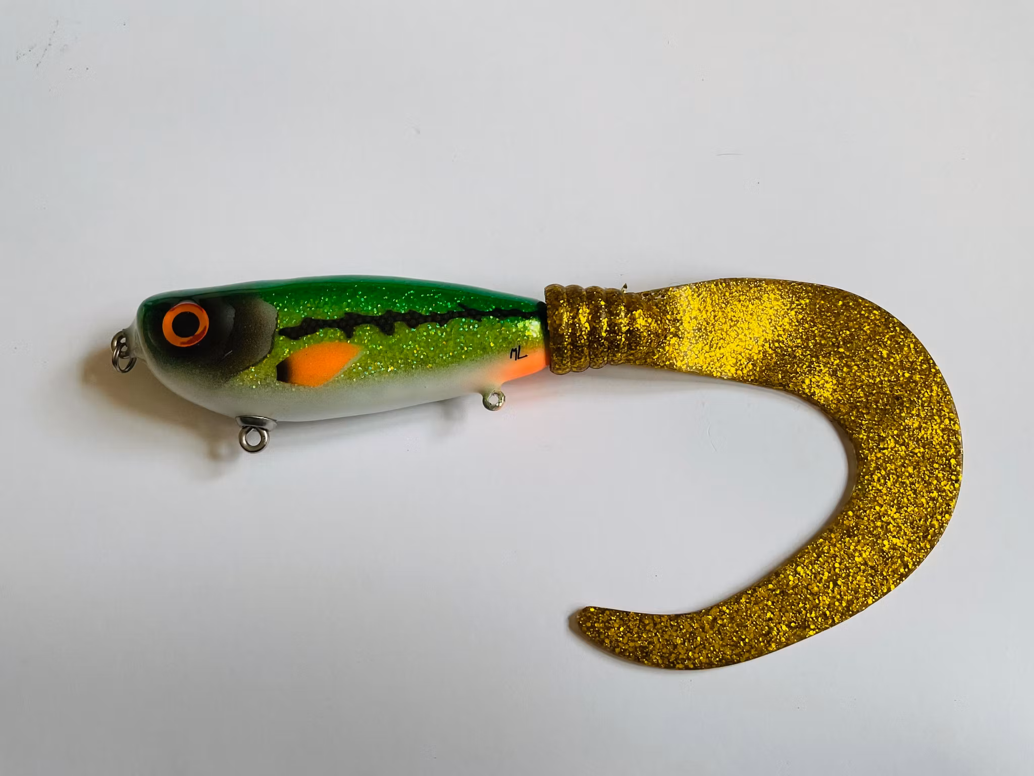 Mammut tail, a new tailbait that pushes a lot of water with its wide profile and large tail. Of course with a stainless spiral when you want to change the tail or why not put on a paddle. is in a shallow/slowsink design. Weight approx. 120-130 grams and with a length of 13 cm ex tail. Perfect for fishing in spring bays You you can fish it very shallow.